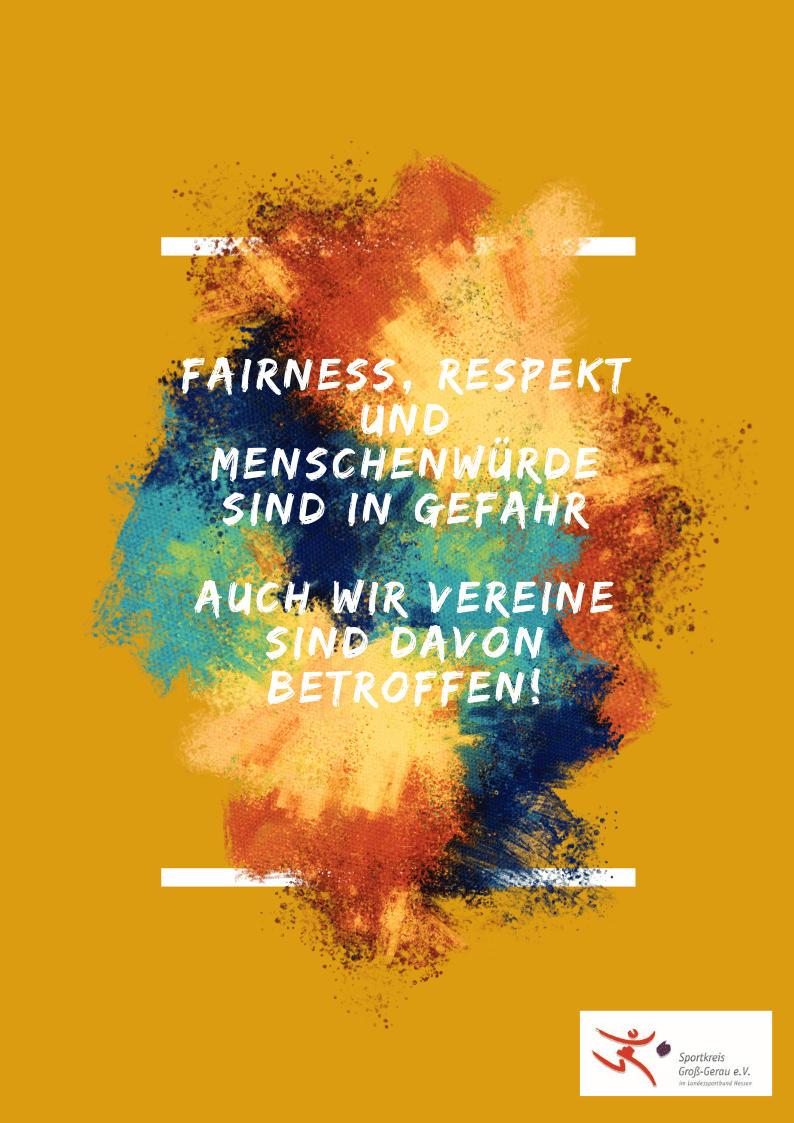 Der Sportkreis Groß-Gerau befasst sich schon seit längerem mit diesem Thema zu extremen und extremistischen Aussagen und Verhaltensweisen im und rund um den Sport. Symbolhaft wurden die Schilder „Kein Platz für Rassismus“, später „Respekt“ an den Sportstätten angebracht. „Wie die Vorkommnisse der jüngsten Vergangenheit belegen, ist dieses Projekt hoch aktuell, die Fragestellungen sind aber so weit reichend und vielfältig, dass wir nur gemeinsam Erfolg haben können“, erklärt der Sportkreisvorsitzende Gerald Kummer.