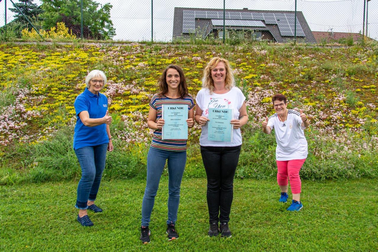 Erfelden: Sina Eberling (2.v.li.) von der SKG Erfelden und Monika Stölzmann (2.v.re.) vom TV Erfelden umrahmt von Petra Scheible (2. Vorsitzende SK GG, li.) und Corinna Geiß (Jugendwartin SK GG, re.) bei der Jugendförderpreisübergabe.