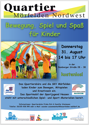 Das Quartiersbüro und die SKV Mörfelden laden in Kooperation mit der Sportkreisjugend Groß-Gerau Kinder zum Bewegen, Mitspielen und Kreativsein sein.