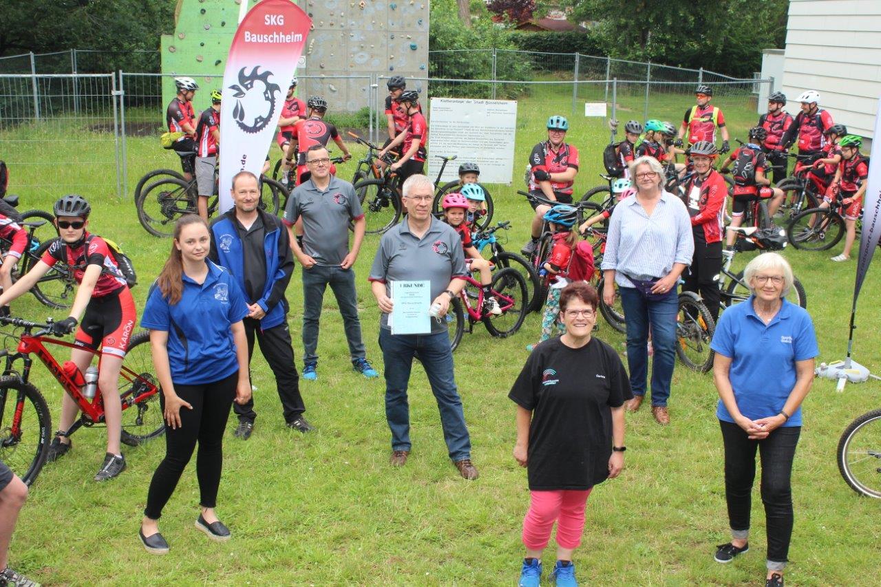 Ebenfalls zu den kleineren Vereinen gehört die SKG Bauschheim mit der Abteilung Radsport. Sie erhielten 200 € Preisgeld. Trotz Pandemiezeit machte man es möglich, unter Einhaltung der damaligen Regeln, Training stattfinden zu lassen. Altersgemischte Gruppen nach technischen Fähigkeiten und Kondition. Hier betreuten ältere Jugendliche die jüngeren Kinder, übernahmen Verantwortung. So konnten junge Erwachsene für das Trainer Team gewonnen werden. Vorbilder für die jungen Nachwuchssportler. Außerdem fand am 25. Oktober 2020 das 10 MTB Rennen unter Corona Bedingungen als zusätzliche Motivation zu den anstrengenden Trainingseinheiten statt. Ohne Zuschauer und mit Maskenpflicht aller Anwesenden. Hygienesheriffs überwachten die Einhaltung der strengen Hygieneregeln. So konnten Wettkämpfe in allen Altersklassen durchgeführt werden. Startgelder aus dem Hobby-Erwachsenen-Rennen wurden traditionell an die Stiftung „Besi & friends“, welche es sich zur Aufgabe gemacht hat Menschen mit Autoimmunkrankheiten und neurologischen Erkrankungen zu unterstützen.