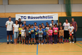 Die Handball-Kids dürfen sich in der Sporthalle der Gustav-Heinemann-Sporthalle austoben. Am Ende stellten sie sich gemeinsam mit der stellvertretenden Sportkreisvorsitzenden Monika Stöltzing-Kemmerer für ein Gruppenbild auf. Der Sportkreis Groß-Gera  hat im Juni 2023 den Jugendförderpreis 2022 an die Handballabteilung der TG Rüsselsheim überreicht.