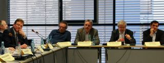 Forum2: Sportkreis-Forum: Kreisstadt-Bürgermeister Stefan Sauer, Robert Neugebauer (Sportamt Rüsselsheim), die Bürgermeister Richard von Neumann (Ginsheim-Gustavsburg), Peter Becker (Mörfelden-Walldorf) und Jan Fischer (Nauheim, von links).