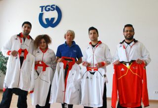 DOSB-Vorstandsvorsitzender, und Monika-Sabine Krapf, Leiterin der AG Olympische Spiele. Symbolisch durften bei TGS Walldorf die ersten Flüchtlinge die neue Sportbekleidung für alle von den Vereinen betreuten Asylbewerber übernehmen. Sichtlich stolz zogen sie die Sportanzüge an.
