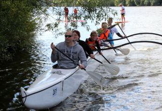 Mitmachen war auch beim Wassersportverein Undine angesagt. Vorsitzender Joachim Fritz freute sich über die positive Resonanz. Den ganzen Tag waren die Outrigger und Stand-up-Boards auf dem Main unterwegs gwesen. Weitere Angebote gab es beim Rope Skipping, Tai Chi, Kartfahren, Speedstacking, es wurden Tänze gezeigt und Shiatsu-Massage angeboten. Auch das Sportabzeichen konnte abgelegt werden. Dank der Unterstützung aus vielen Bereichen wurde das Fest in Rüsselsheim ein voller Erfolg. Neben dem Oberbürgermeister kam auch Landrat Thomas Will zum Mitmachen vorbei. Barbara Bruce Micah von der Sportjugend Hessen probierte neue Sportarten aus, Eckhard Cöster vom LSBH Referat Breitensport und Sportentwicklung übte sich im Rollstuhlbasketball unter Anleitung von Präsident Gerhard Knapp (HBRS). Nicht zuletzt sorgten der Sportbeauftragte des Kreises, Klaus Astheimer, und das Dream-Team vom Sportkreis für den Erfolg.