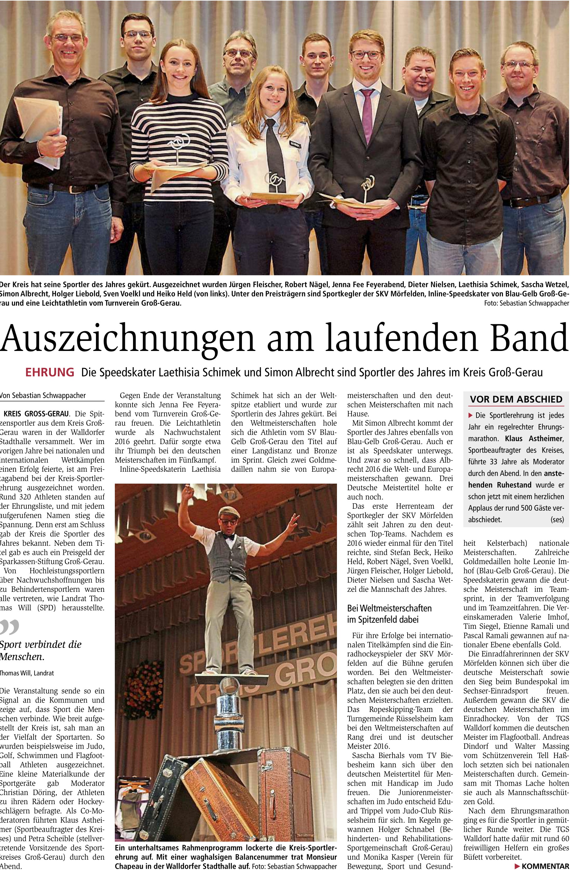 Für ihre Erfolge bei internationalen Titelkämpfen sind die Einradhockeyspieler der SKV Mörfelden auf die Bühne gerufen worden. Bei den Weltmeisterschaften belegten sie den dritten Platz, den sie auch bei den deutschen Meisterschaften erzielten. Das Ropeskipping-Team der Turngemeinde Rüsselsheim kam bei den Weltmeisterschaften auf Rang drei und ist deutscher Meister 2016.