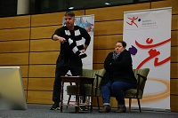 Christian Suhr, Leiter der Büchner-Bühne, hatte mit Christine Linzer und Oliver Kai Müller die Besucher der Auftaktveranstaltung mit einem Szenenspiel über einen dunkelhäutigen Fußballspieler den Abend begonnen. Nach Affenlauten und Bananenwürfen der „Fans“ kam es fast zum Spielabbruch. In der anschließenden Diskussion wurde dies in Kleingruppen thematisiert.